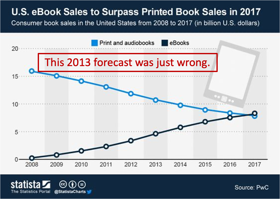 For the first few years of their existence (2008-2010), there was dramatic growth in the popularity of ebooks. Kindles, Kobos, iPads and other tablets were flying off the shelves and sales of ebooks were very strong. I can tell you that when Sony first launched their E-reader in Canada in 2008, publishers feared it might actually spell the end of physical books. In fact, one forecast from 2013 by Price Waterhouse Coopers projected that ebooks would surpass physical and audio books by 2017. Nope. That never happened.