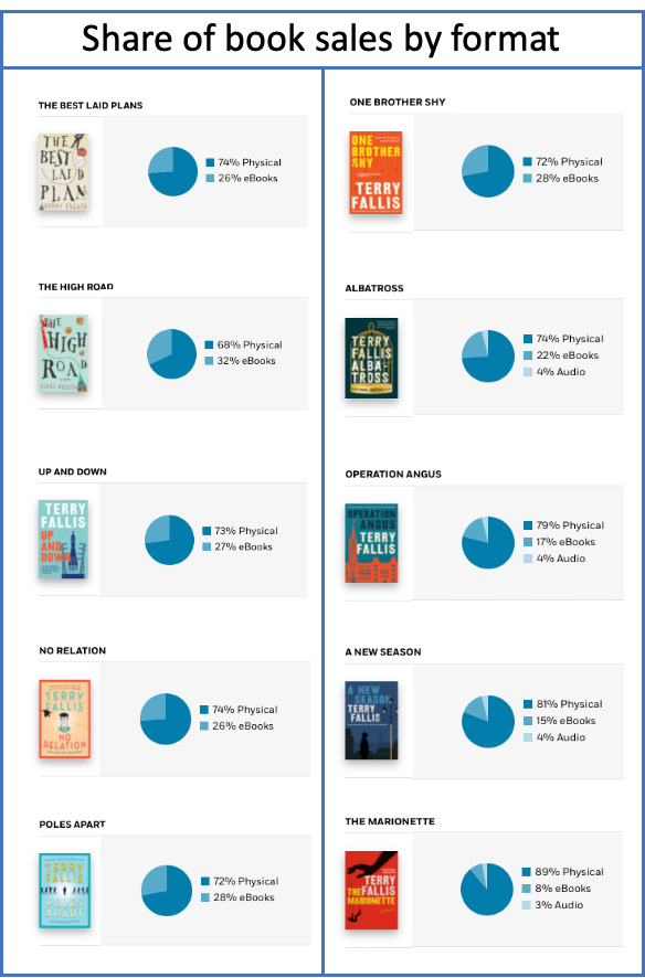 Here’s a summary of the share of book sales by format. As suggested earlier, there was an initial flurry in ebook sales growth. My debut novel, The Best Laid Plans was published in 2008, just as E-readers were hitting the market. All these years later, Ebooks currently represent 26% of cumulative sales of my debut novel. My follow-up novel, The High Road, in 2010 (the peak in ebooks sales growth) enjoys a cumulative ebook sales share of 32%. As you go down the two columns below, you’ll see a plateauing of ebook sales share at around 27% until 2015 when my sixth novel, One Brother Shy hit bookstores. After that, there’s been a steady decline in sales share for ebooks from 22% on my seventh novel, Albatross, to 8% for my tenth novel, The Marionette. Interesting. (Now it’s possible that as a book ages and perhaps is less available in physical form, readers turn to ebooks. So I’ll monitor what happens to my share of ebooks sales on my last couple of novels to see if it rises in the coming years.)
